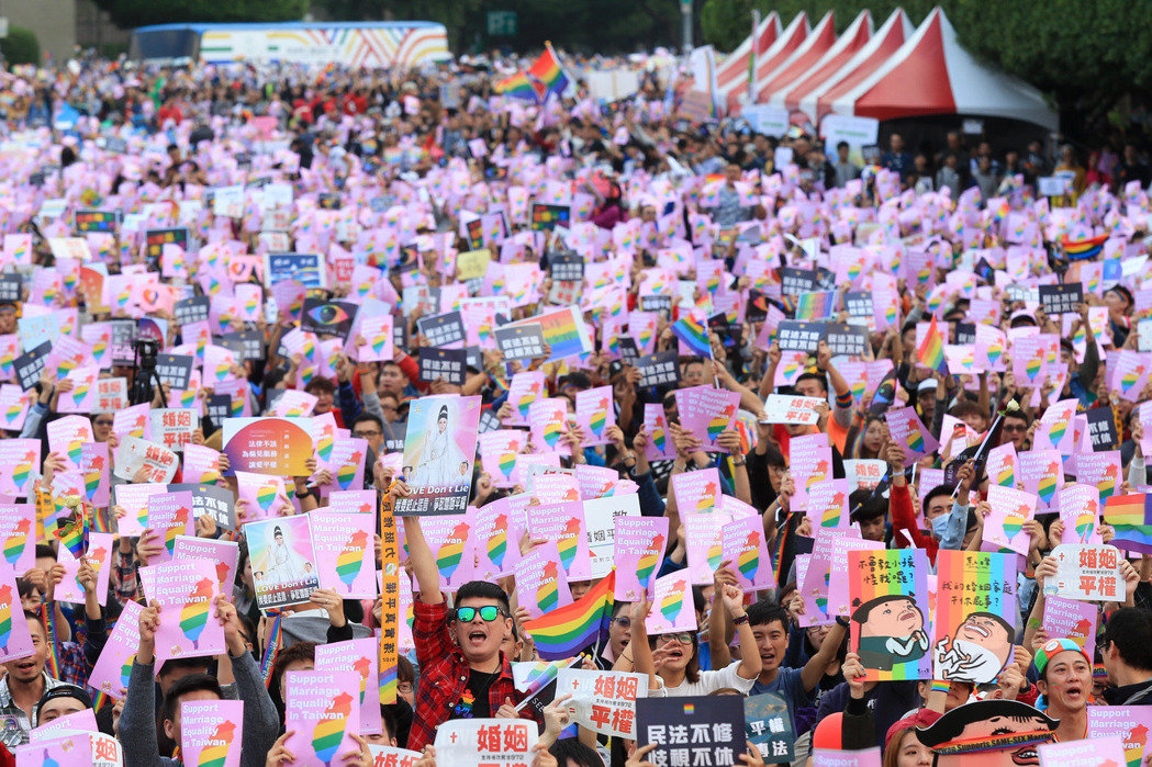 挺同團體10日在凱道舉辦“讓生命不再逝去為婚姻平權站出來”音樂會,總計有23組藝人響應齊力接唱相挺婚姻平權,數十萬人走上凱道。(圖片來源:臺灣《聯合報》)