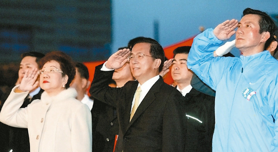當(dāng)年,陳水扁擔(dān)任臺(tái)灣地區(qū)領(lǐng)導(dǎo)人期間,馬英九曾以中國(guó)國(guó)民黨主席身份出席元旦升旗活動(dòng),與陳水扁、呂秀蓮并肩而立。(圖片來源:臺(tái)灣《聯(lián)合報(bào)》)
