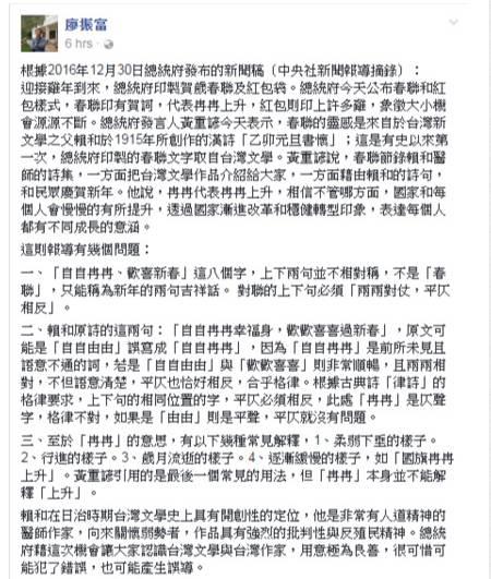 他在“臉譜”上發(fā)文,從平仄、詞語解釋以及用法三大方面給“總統(tǒng)府”上了一堂“文學(xué)通識課”。
