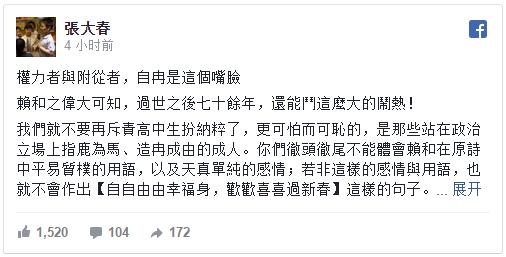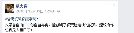 臺灣著名作家張大春更是連續(xù)三日在Facebook上發(fā)文,反問“總統(tǒng)府”“爸媽沒叫你認(rèn)字嗎”,諷刺總統(tǒng)府“笨蛋”。“人家自自由由,你自自冉冉,還發(fā)明了個荒腔走板的說頭,‘總統(tǒng)府’你也真是太自由了。”