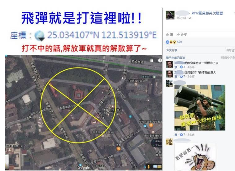 1月2日晚,名為莊士弘的臺灣網友在Facebook上轉發了一張“總統府”的衛星地圖,圖片上專門用黃色標記圈起位置,并“貼心”地附上詳細坐標,還給解放軍撂下這樣兩句話:“飛彈就是要打這里啦!打不中的話,解放軍真的解散算了!”。