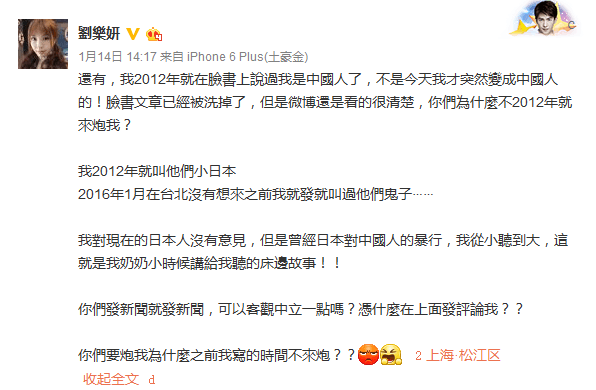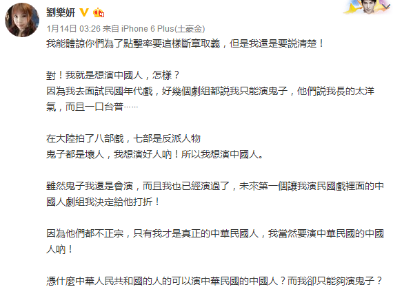 針對劉樂妍再次引發的輿論爭議,環球時報-環球網記者找到其個人微博,發現其近期微博均和“認同中國人身份”爭議言論有關。劉樂妍1月14日曾發文稱,“我2012年就在臉書上說過我是中國人了,不是今天我才突然變成中國人的”“我就是想演中國人,怎樣?因為我去面試民國年代戲,好幾個劇組都說我只能演鬼子,他們說我長的太洋氣,而且一口臺普 鬼子都是壞人,我想演好人!所以我想演中國人。”