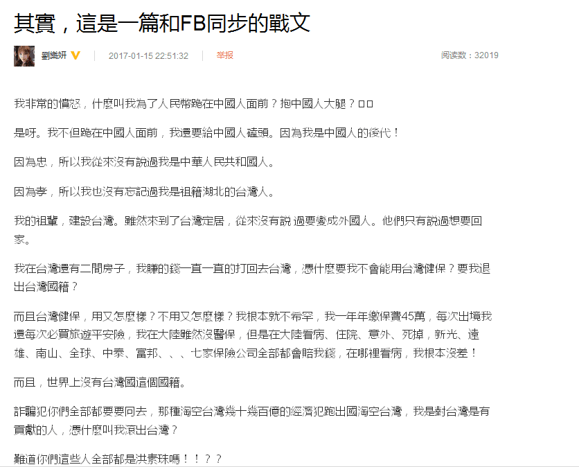 據臺灣《自由電子報》16日報道,劉樂妍15日在臉譜發文,反問“什么叫我為了人民幣跪在中國人面前?抱中國人大腿?”她說:“是呀。我不但跪在中國人面前,我還要給中國人磕頭。因為我是中國人的后代!”最后,劉樂妍更直接稱,“世界上沒有臺灣國這個國籍”,并表示自己對臺灣是有貢獻的人,“憑什么叫我滾出臺灣”。