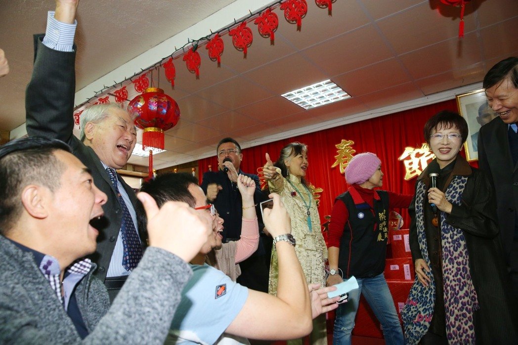 洪秀柱進(jìn)入活動會場后,受到在場民眾歡呼及支持,她還用寧波話跟大家拜年。