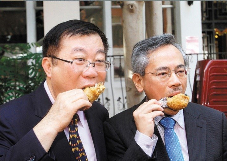 陳;(左)和邱文達(右)擔任臺“農委會主委”、“衛生署署長”時,也曾公開大啃雞肉,來證明安全。(臺灣《聯合》報系資料圖)