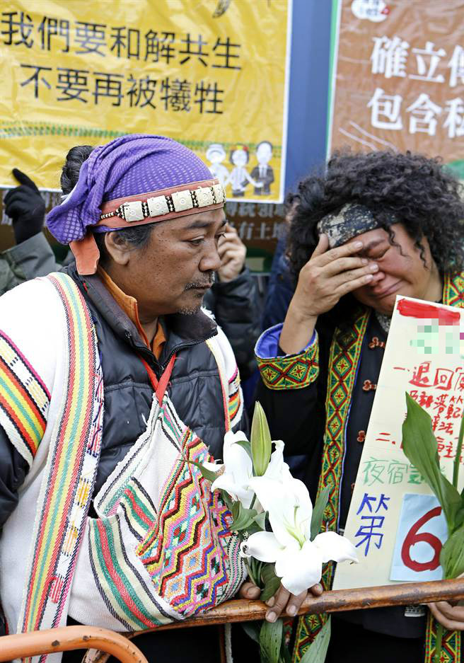2月28日,臺(tái)少數(shù)民族歌手那布(左)與巴奈(右)夫婦等人在凱道召開“二二八轉(zhuǎn)型正義 蔡英文歸還傳統(tǒng)領(lǐng)域,不要再騙!”記者會(huì),說到激動(dòng)處,巴奈不禁流淚。(圖片來源:臺(tái)“中時(shí)電子報(bào)”)