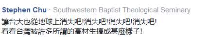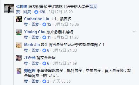對于臺大課堂上這項給予“綠委”充分“發揮空間”的票選題目,眾多臺灣網友卻并不買賬。不少網友都在社交網站“臉譜”(Facebook)上留言,將矛頭紛紛對準臺大。有網友酸諷,誰可以舉辦一個“最該在地球上消失的大學測驗嗎?”有人更直言,“不意外,臺北帝國大學(臺大舊稱)”,“讓臺大也從地球上消失吧”,還有網友感嘆,“怕以后只有大陸的國歌可以聽了,無法理解“臺獨”對臺灣人民有什么好處?”【環球網報道 記者 徐亦超】