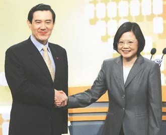 前臺灣地區領導人馬英九和臺灣地區領導人蔡英文握手(圖片來源:臺“聯合報”)