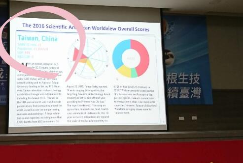 臺灣“生技醫(yī)藥國家型計劃”成果發(fā)表會22日在“臺大醫(yī)院國際會議中心”召開。在計劃總主持人楊泮池介紹成果的簡報上,出現(xiàn)了“Taiwan,China”。這被“綠委”林靜儀發(fā)現(xiàn),并將簡報畫面上傳到其臉譜上,表示,“蛤?我看到什么?楊泮池校長,你準備簡報時覺得沒問題嗎?”