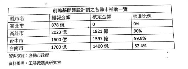 王鴻薇指出,前瞻計劃補助嚴(yán)重不均,高雄提供2023億元,“政院”核定1821億元,比例達九成;臺中提報的1600億元只小刪3億元,幾乎全數(shù)通過。臺北卻因柯市府事前爭取不力、事后裝聾作啞,9項提案全被打槍,而市長施政報告中一字不提,她要嚴(yán)重抗議。