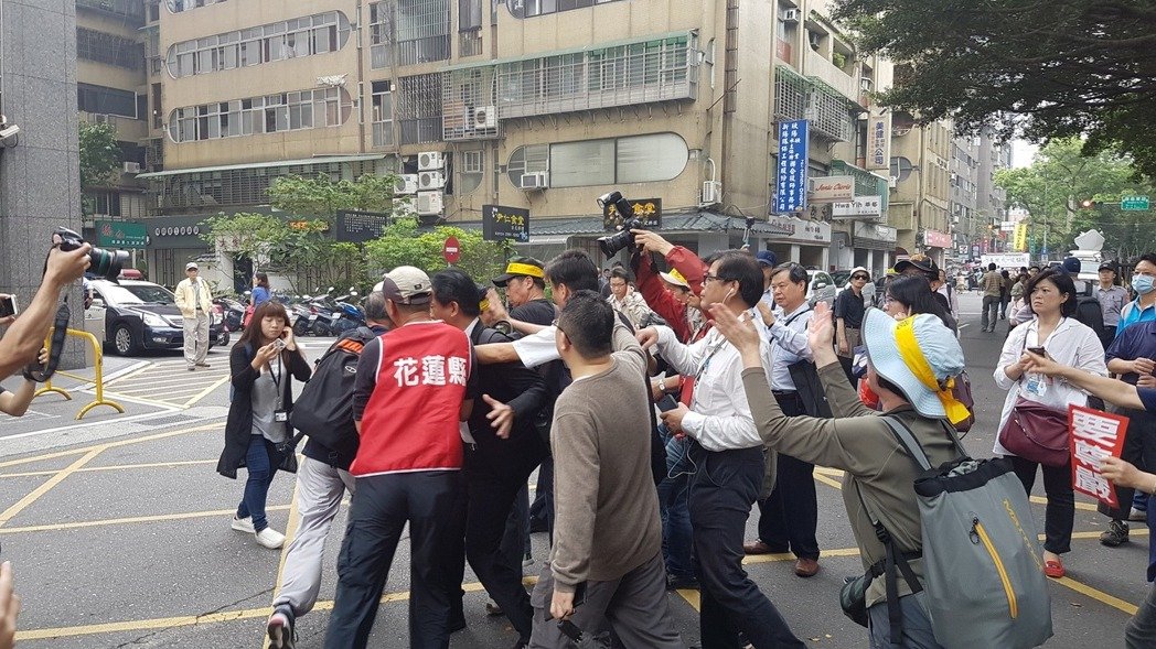 反年改團(tuán)體包圍“立法院”,民進(jìn)黨籍“立委”林俊憲遭群眾推擠拉扯。(圖片來源:臺(tái)灣《聯(lián)合報(bào)》)