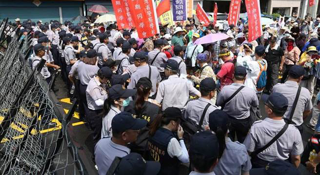 反年改抗議群眾200多人在場(chǎng)外與維安警力對(duì)峙。(網(wǎng)絡(luò)圖)