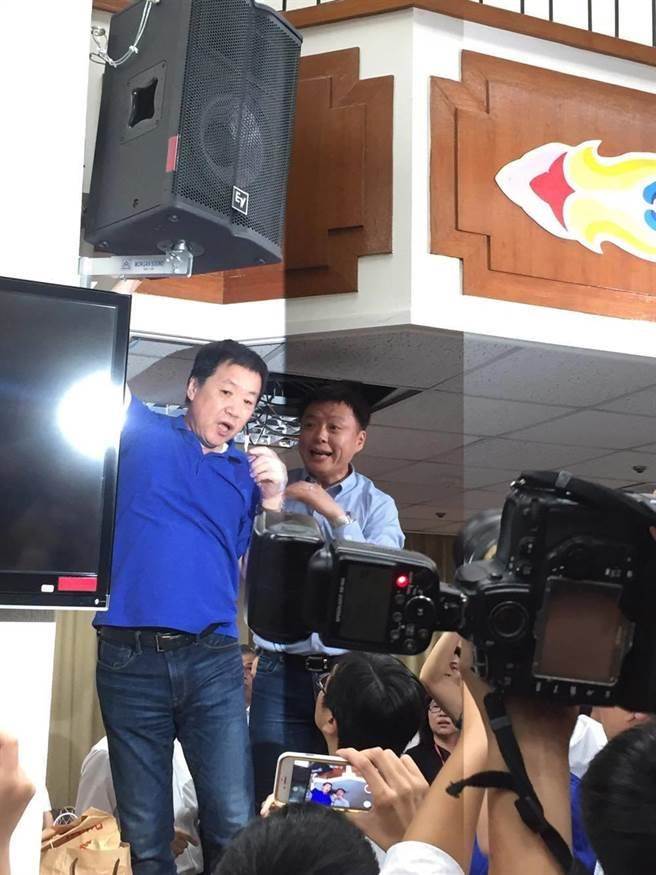 “藍委”費鴻泰(左)爬高破壞喇叭,“綠委”趙天麟(右)上前制止。(圖片來源:臺灣“中時電子報”)