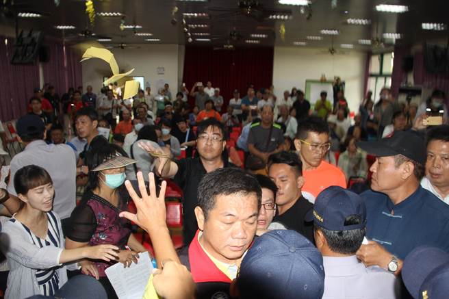 南鐵東移東區(qū)第二場(chǎng)公聽會(huì)遭居民質(zhì)疑程序違法,丟冥紙抗議,現(xiàn)場(chǎng)爆發(fā)沖突。(圖片來源:臺(tái)灣“中時(shí)電子報(bào)”)