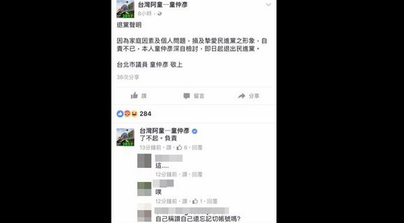 童仲彥曾是民進(jìn)黨臺北市議員,因為家暴、外遇風(fēng)波鬧得沸沸揚揚后宣布退出民進(jìn)黨,但疑似忘記切換帳號,自己留言“了不起,負(fù)責(zé)”,淪為各界笑柄。