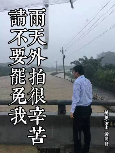今年6月臺灣北部淹水,“時代力量立委”黃國昌回新北選區(qū)勘災(zāi)。照片中,一旁的人撐著傘或穿雨衣,僅他一人濕身一片,但遭到大批網(wǎng)友諷刺上演“濕背秀”。網(wǎng)友惡搞改圖狠酸黃國昌是“立法院最佳演員”、“雨天外拍很辛苦,請不要罷免我”、“難道濕身比較帥?”、“時力買不起雨衣?”等。