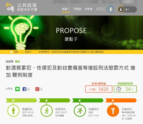 中國臺灣網11月3日訊 據臺灣《中時電子報》報道,近年來,臺灣的性侵事件防不勝防,有網友在上月23日針對性侵、酒駕及幼童傷害,擬增設“鞭刑制度”,并在“公共政策網絡參與平臺”提案,目前已有5000人附議通過,相關機構須在明年1月3日前響應。