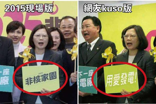 民進黨昔日打著“非核家園”的反核旗幟撈選票,也曾喊出“用愛發電”等口號,如今已幾乎成為兩岸民眾的笑柄。圖為島內網友借此調侃蔡英文。(臺媒合成圖)