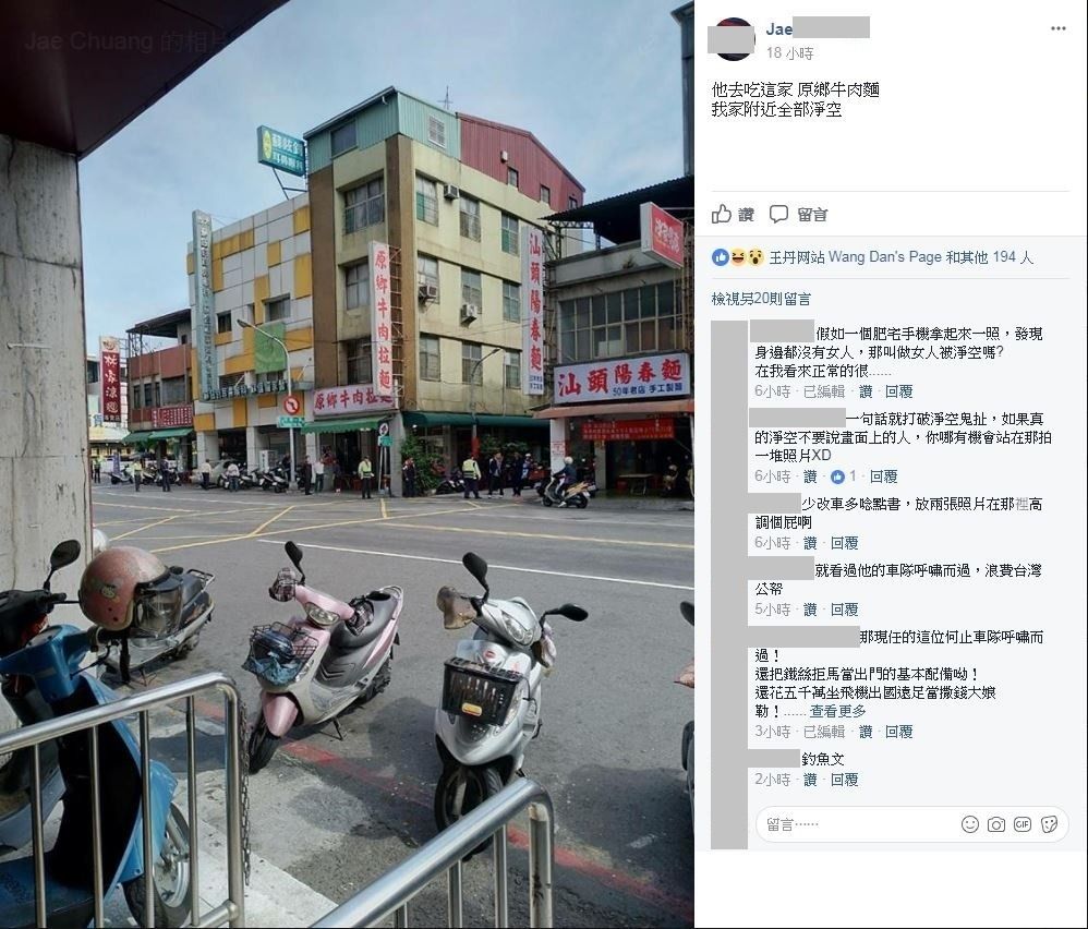 據悉,這張是馬英九夫婦19日南下吊唁已故詩人余光中之后,到牛肉面店吃午餐的照片,但有網友在王丹的個人主頁上公布了兩張面店外的“維安”照片,指“我家附近全部凈空”,可沒想到遭網友“打臉”嗆聲,“本來那里就沒啥人了,何況照片上有凈空嗎?”“凈空你還能拍照呀”、“等紅燈那個騎士是石像嗎?”