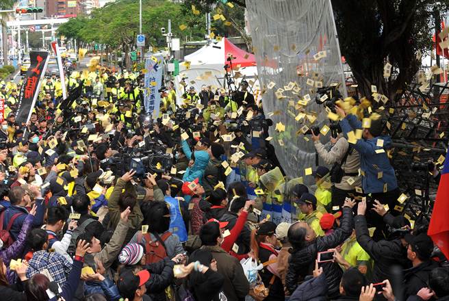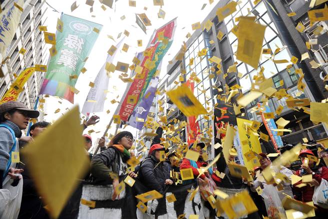 臺灣勞團(tuán)繞行“立法院”撒冥紙,表達(dá)不滿。(圖片來源:臺灣“中國時報”)