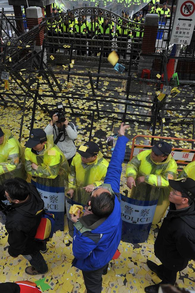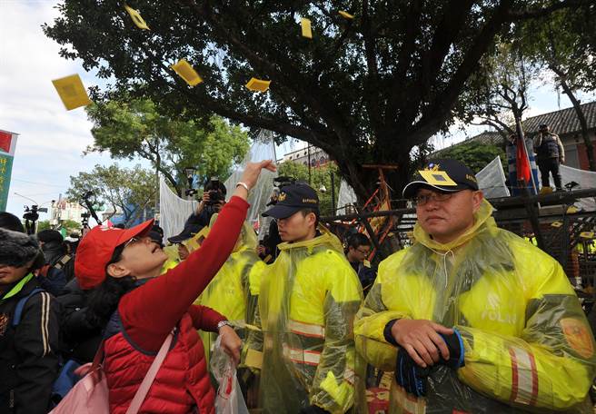 臺灣“立法院”三讀通過“勞基法”修正案,場外抗議的勞團(tuán)成員繞行“立法院”撒冥紙,而警員們則排成人墻警戒。(圖片來源:臺灣“中國時報”)