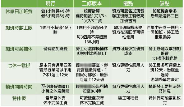 臺灣物理治療師林長揚近日整理了“勞基法”修正案中被修改的內容,并制成圖表供網友閱覽,從現行規定到新修正案作出一系列的比較,列出了6大點,并提出雖然部分規定都強調可以“勞資協商”,“但你我都知道,臺灣大部分的勞資協商都是……臺灣勞工,真的很軟呢!期待‘勞動部’進一步函釋,與落實勞檢!”
