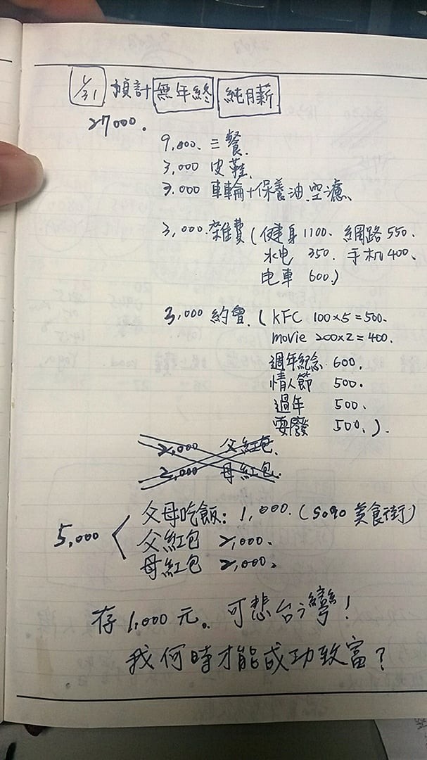 在王男公開的1月份預估收支表中,大略記下主要花費,包括三餐9000元、皮鞋3000元、汽車保養3000元(車輪、保養油等)、雜費3000元(健身、網絡、手機等)、約會3000元(吃肯德基、看電影等)、父母紅包5000元,加一加得花26000元,難怪他無奈又憤怒寫下,“存1000元,可悲臺灣!我何時才能成功致富?”