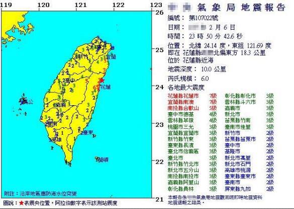 最新消息顯示,中國地震臺網(wǎng)已正式測定,2月6日23時50分在臺灣花蓮縣附近海域(北緯24.13度,東經(jīng)121.71度)發(fā)生6.5級地震,震源深度11千米。而據(jù)臺灣“東森新聞云”報道,花蓮6日深夜發(fā)生大規(guī)模主震后,至今已發(fā)生104起余震,最新一起是7日清晨6時11分、規(guī)模2.9級的有感地震,花蓮縣有關部門稍早時也宣布7日停班停課。