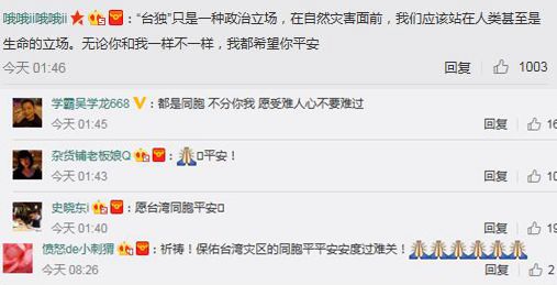 此外,在眾多的祈福帖中,還有一種令人無法忽視的溫暖聲音,那就是“同胞之情”。當如今的臺灣被“臺獨”勢力染指時、當一小部分臺灣民眾被蔡英文當局所謂的“臺灣價值”洗腦時,大陸網友則是在大災面前溫情喊話:臺灣與大陸是同胞,希望同胞平安!