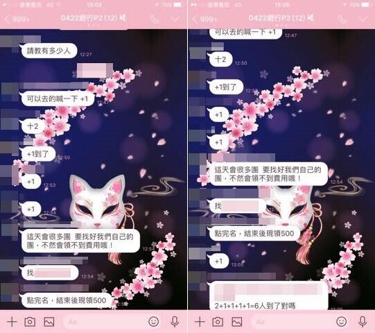童仲彥留言表示,“這絕對不是網軍!這是阿童的好朋友滲透進line群組截到的圖,領500?是走路工嗎?”截圖內容則可以看見,LINE群組共有12名成員,對話內容說:“這天會很多團,要找我們自己的團,不然會領不到費用。”“點完名,結束后就現領500。”等對話。