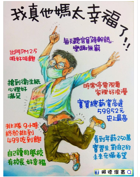 臺(tái)灣漫畫家阿德在臉書“阿德漫畫”粉絲頁(yè)發(fā)表最新諷刺漫畫,并列舉8項(xiàng)他認(rèn)為近期內(nèi)最幸福的事件,包含“每天聽官員‘蔣干話’樂趣無(wú)窮”、“時(shí)常停電限電家里好浪漫”、“實(shí)質(zhì)總薪資高達(dá)59852元(新臺(tái)幣,下同)史上最高”、“看到年薪250萬(wàn)元實(shí)習(xí)生對(duì)自己的未來(lái)充滿希望”、“出門PM2.5 吸好飽”、“搶到衛(wèi)生紙心里好滿足”、“排隊(duì)9小時(shí)終于排到499吃到飽”、“自己讀的學(xué)校有校長(zhǎng)好幸福”。