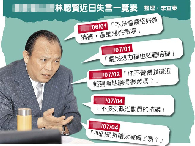 “農委會主委”林聰賢近日失言一覽表。(圖片來源:臺灣《中時電子報》)