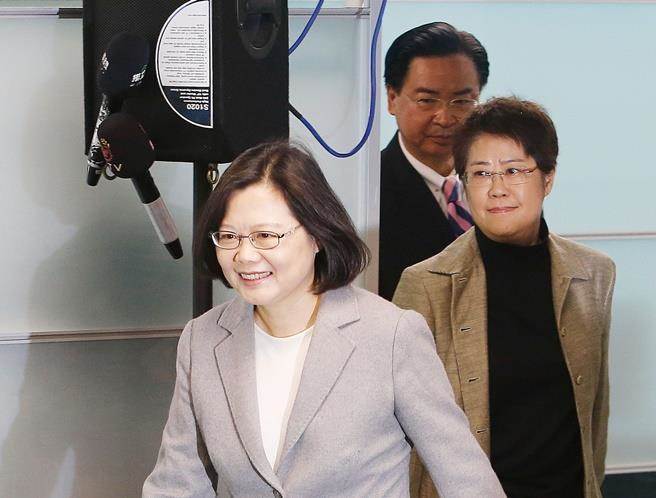 2015年時任民進黨主席的蔡英文(前)在小英基金會執行長張振亞(中)的陪同下,完成民進黨內提名參選登記,不難看出兩人的好交情。(圖片來自臺媒)