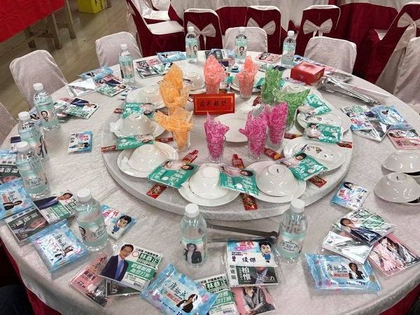 網(wǎng)友出席宴請(qǐng),看見(jiàn)餐桌上擺滿市議員候選人的競(jìng)選面紙和礦泉水,讓他非常傻眼。(圖片來(lái)自臺(tái)媒)