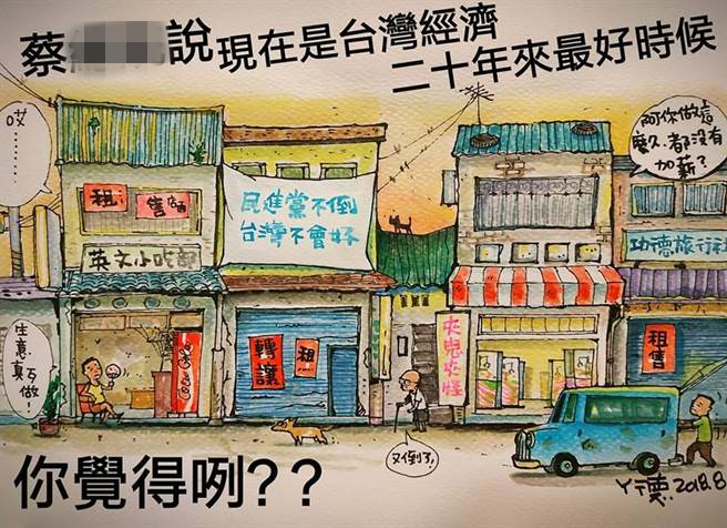 雖然蔡英文在許多場合中強(qiáng)調(diào)臺灣經(jīng)濟(jì)好,但各行各業(yè)仍叫苦連天。對此,“阿德漫畫”則在臉譜網(wǎng)畫出一張漫畫,圖中的房子有許多都貼著租、售、轉(zhuǎn)讓等字樣,還有人喊著“生意真歹做”“啊你做這么久,都沒有加薪?”此外,近日的夾娃娃機(jī)風(fēng)潮也在圖中;“民進(jìn)黨不倒,臺灣不會(huì)好”的海報(bào)高高掛起。“阿德漫畫”諷刺表示,臺灣經(jīng)濟(jì)20年來最好狀態(tài)?有沒有到街上看過?