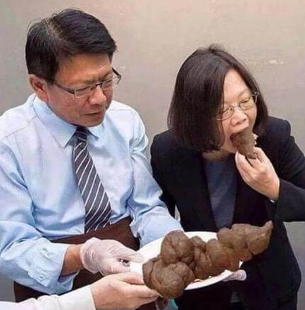 另有網友發出多張蔡英文照片回應,一張是蔡吃面包的,留言說,她正在吃;另外一張是李登輝與蔡英文耳語合照,上面寫著“我岬你講,臺灣人憨憨啊,騙不成,記得要拗,繼續騙,就對了”。(中國臺灣網 李寧)