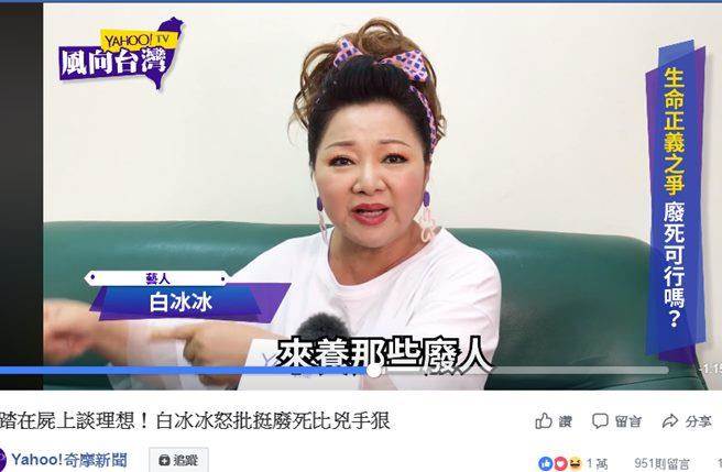 “這些讀書人是白讀書了嗎?”白冰冰稱大多數民意是不應該廢除死刑,為何臺當局不聽,是又回到帝制時代了嗎?也不解為何民眾選你們出來了,當局卻用自己的意志在做事,“然后為什么我們應該跟國際接軌?跟國際見鬼了!”反問美國是我們阿公?還是哪一國是我們阿嬤?為什么不聽自己內心話。白冰冰更向臺當局“法務部長”、法官等人喊話,“若該做的事情你不做,不應該領錢,不應該違背大家意志領大家的錢。”更舉例若是死刑犯沒死,那些被分尸的受害人父母就得繼續賺錢繳稅金來養這些廢人,養到死,讓她覺得這道理根本不對。