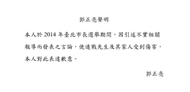 郭正亮道歉聲明。(圖片來自臺媒)