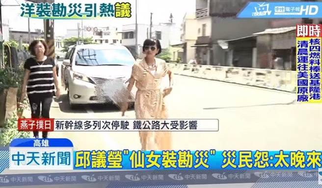 水災過去13天后,邱議瑩終于關心燕巢危屋,但一身飄逸長裙洋裝外加時尚太陽眼鏡出現,彷彿要去看秀,看到現場媒體還酸“太關心我了吧!”(圖片來源:臺灣中天新聞)