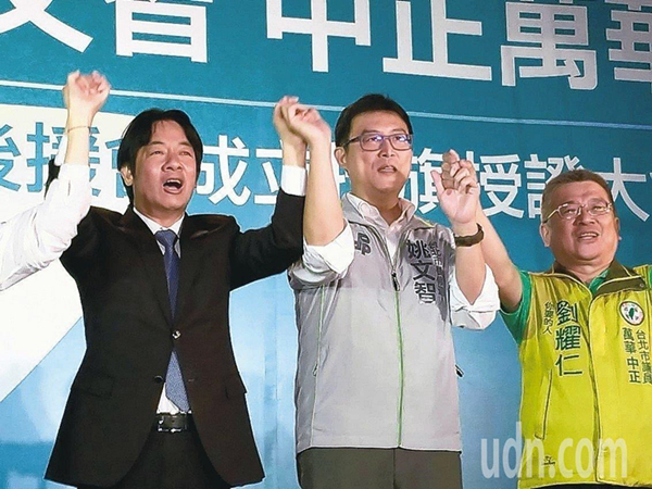 賴清德(左)5日晚間前往姚文智(中)造勢場合,助講拉抬選情。(圖片來源:臺灣《聯(lián)合報(bào)》)