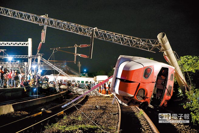 普悠瑪列車于新馬車站出軌,5個(gè)車廂翻覆,5、7、8節(jié)傾覆最嚴(yán)重,但臺(tái)鐵說(shuō)普悠瑪經(jīng)特檢沒(méi)問(wèn)題。(圖片來(lái)源:臺(tái)灣“中時(shí)電子報(bào)”)