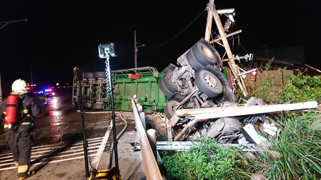 載有醋酸的化學品運輸車輛5日凌晨行經(jīng)臺2線貢寮段撞到電線桿后翻車,導致醋酸外泄,車頭掉落至一旁邊坡,司機李某受困車頭內(nèi)。(圖片來源:臺灣“中時電子報”)