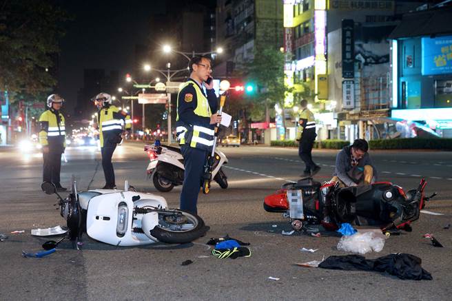 車禍現(xiàn)場(chǎng)一片凌亂,警方在事故現(xiàn)場(chǎng)測(cè)量調(diào)查。(圖片來(lái)源:臺(tái)灣“中時(shí)電子報(bào)”)