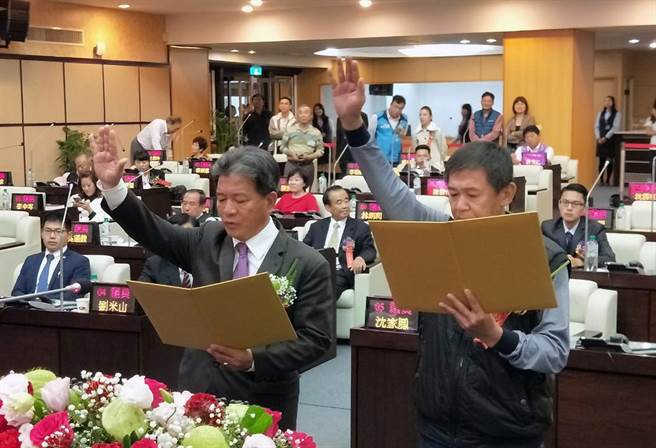 郭信良(左)、無黨籍林炳利贏得臺南市正副議長選舉后隨即宣誓就職。(圖片來源:臺灣“中時電子報”)