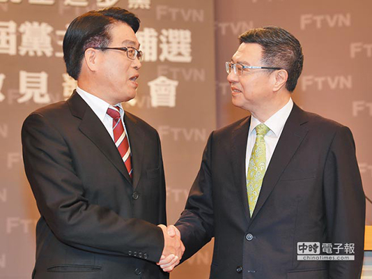 民進黨第16屆黨主席補選電視政見發表會4日舉行,前臺當局“行政院秘書長”卓榮泰(右)與“臺灣民意基金會”董事長游盈隆(左)會前相互握手致意。(圖片來源:臺灣“中時電子報”)