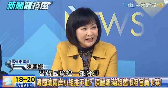 高雄議員陳麗娜昨晚透露,高雄市政府內部充斥著陳菊時代舊官員,他們近期多次“卡韓”。(圖片來源:臺灣“東森新聞云”)