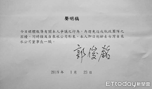 今日媒體報(bào)導(dǎo)有關(guān)本人爭議之行為,為了避免執(zhí)政團(tuán)隊(duì)困擾,同時(shí)損及自來水公司形象,本人即日起辭去臺(tái)灣自來水公司董事長一職。