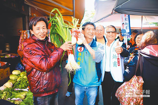 國(guó)民黨“立委”候選人陳炳甫(左二)24日前往市場(chǎng)拜票,菜販送上大蒜和好采頭預(yù)祝高票當(dāng)選。(圖片來源:臺(tái)灣“中時(shí)電子報(bào)”)
