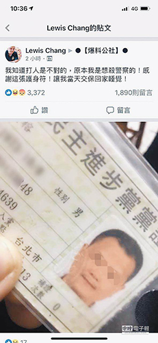 但張某卻于26日晚間在臉譜網(facebook)社團“爆料公社”發文,稱“我知道打人就是不對,我原本是想殺警察的,感謝這張護身符,讓我當天交;丶宜X”,并附上他的民進黨證照片,公開向警方嗆聲。警方認為張某已另涉嫌“恐嚇公眾罪”,將傳喚張某到案后送辦。