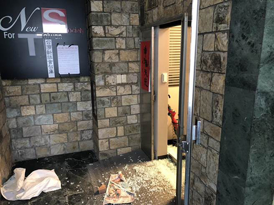 28日上午10點2分左右,江添福獨自一人沖到位于濟南路一段3樓的“臺灣新社會智庫”(民進黨“新潮流系”辦公室)辦公室,先將預先寫好的抗議字條貼在大門外墻上,再拿出預藏的磚頭將辦公室大門砸毀后揚長而去。辦公室人員聞聲外出查看,見狀趕緊打電話向轄區警察局中正一分局報案。